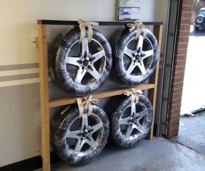 Если ваши шины на ободах, лучше всего повесить их на крюки. И наоборот, вы можете складывать шины в штабель, но помните, что вы должны менять конфигурацию штабеля примерно каждые четыре недели.