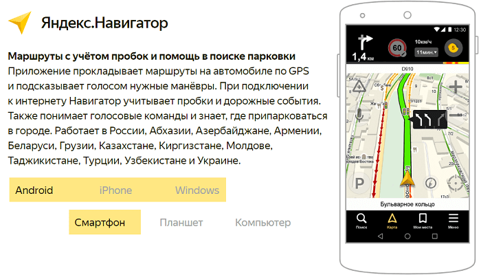 Яндекс.Навигатор Яндекс.Навигатор помогает водителям проложить оптимальный маршрут до пункта назначения. Приложение учитывает пробки, аварии, дорожные работы и другие дорожные события при прокладке маршрута.Яндекс.Навигатор предложит вам до трех вариантов путешествия, начиная с самого быстрого. Если выбранный вами маршрут проходит по платным дорогам, приложение заранее предупредит вас об этом. Яндекс. Navigator использует голосовые подсказки, чтобы направлять вас по пути, и отображает ваш маршрут на экране вашего устройства. Кроме того, вы всегда можете видеть, сколько минут и километров вам осталось, вы можете использовать свой голос для взаимодействия с Яндекс.