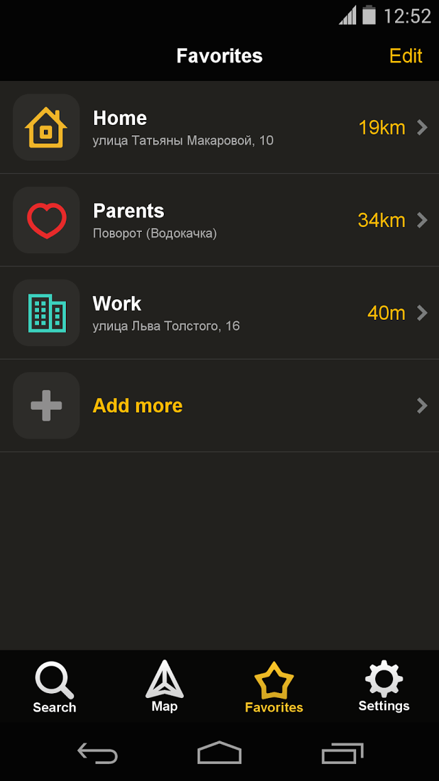 Экономьте время, выбирая недавние пункты назначения из своей истории. Просматривайте свои недавние пункты назначения и избранное с любого из ваших устройств — они сохраняются в облаке и доступны, когда и где они вам нужны.