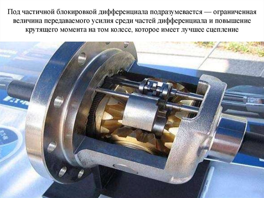 Частичная блокировка отличается тем, что перераспределение момента выполняется в соотношении, меняющемся от условий движения. То есть, такой механизм при потере сцепления одного из колес лишь частично его замедляет, «перебрасывая» момент на другое колесо.