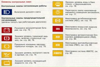 Контрольный щиток со включенными индикаторамиЕсли вы заметили, что на контрольном щитке стали загораться лампы поломок или предупредительные индикаторы, желательно разобраться в обозначении горящих значков.