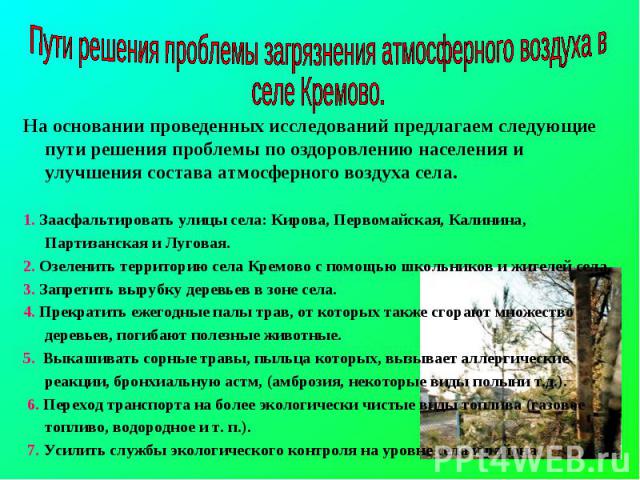 На основании проделанных исследований выделены основные пути решения проблем, связанных с работой транспортной системы города Рязани это, прежде всего: замена двигателей внутреннего сгорания на экологически чистые; замена традиционного топлива на более экологический; размещать равномерно: основные зоны труда, жилых районов, места отдыха; расширить улицы, создать между проезжей частью дорог и жилыми домами фильтров — стен из зеленых насаждений; вынос за городскую черту грузовых транзитных линий; полностью исключить сквозной проезд транспорта через жилой квартал; увеличить зеленые насаждения; внедрение транспорта будущего; внедрение экологического транспорта.