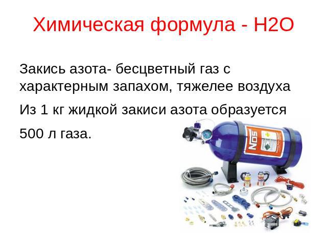 Попадая в камеру сгорания, закись азота возвращается в газообразное состояние и при этом охлаждается до -51 °C. Проходя по воздуховоду этот холодный газ охлаждает воздух идущий в цилиндр. Когда смесь охлаждается, она становится плотнее, позволяя добавить больше бензина. Таким образом холодная, густая рабочая смесь позволяет вытягивать еще большее число лошадей из мотора авто, т.к. от уменьшения температуры в камере сгорания на 10°С получаем прирост в лошадях на 1%. Это значит, что при понижении температуры на 50°C в 300 сильном двигателе получаем 30 л.с.