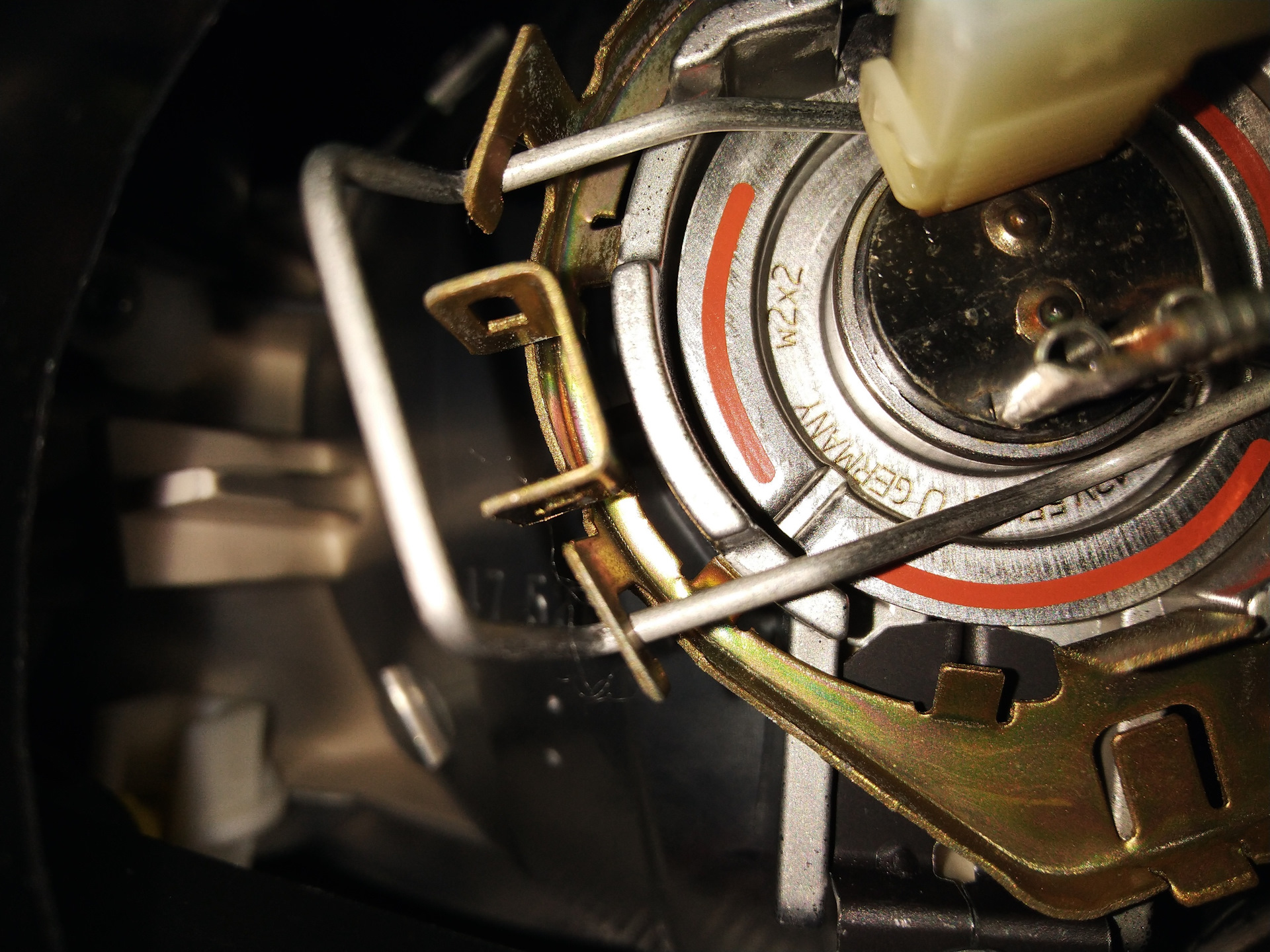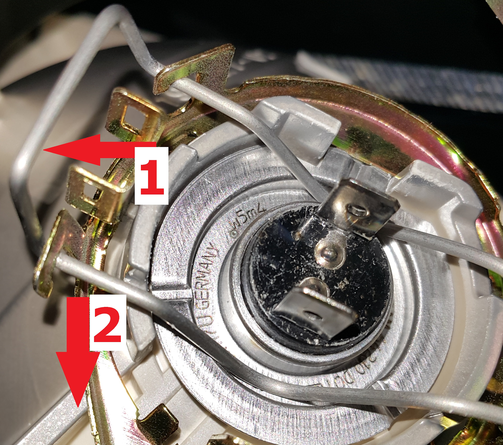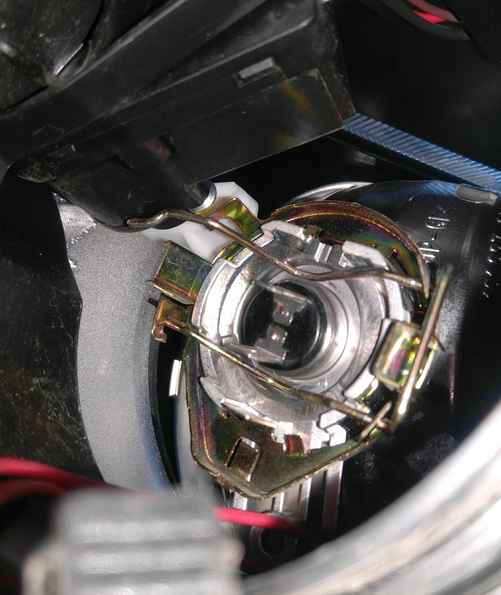 - Со стороны моторного отсека цоколь обычно прижимается к гнезду в корпусе фары двумя изогнутыми пружинящими держателями. Нужно вывести их из зацепления, освободить и аккуратно извлечь лампу