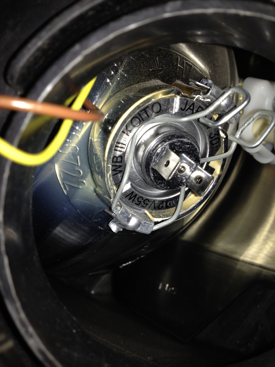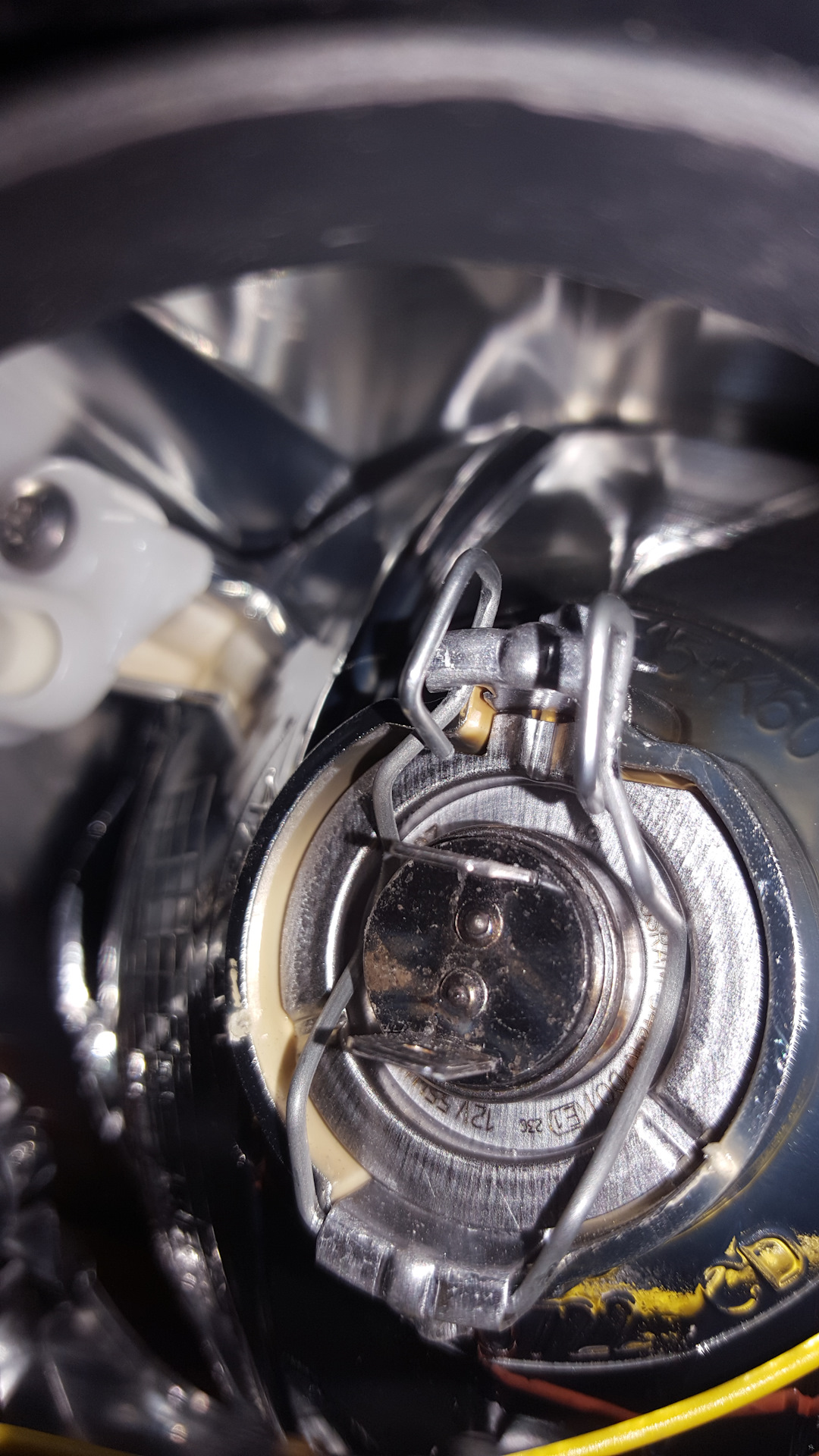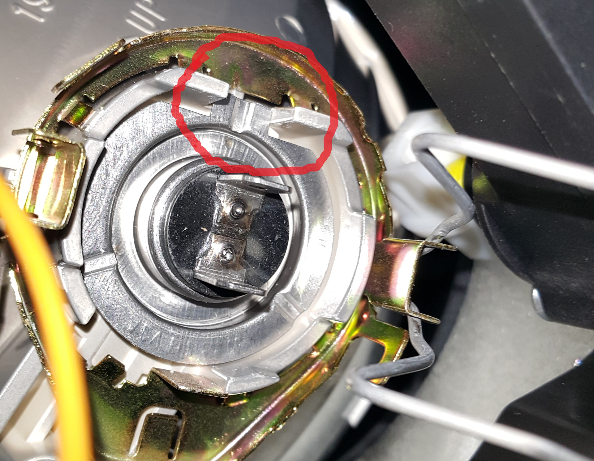 - Со стороны моторного отсека цоколь обычно прижимается к гнезду в корпусе фары двумя изогнутыми пружинящими держателями. Нужно вывести их из зацепления, освободить и аккуратно извлечь лампу