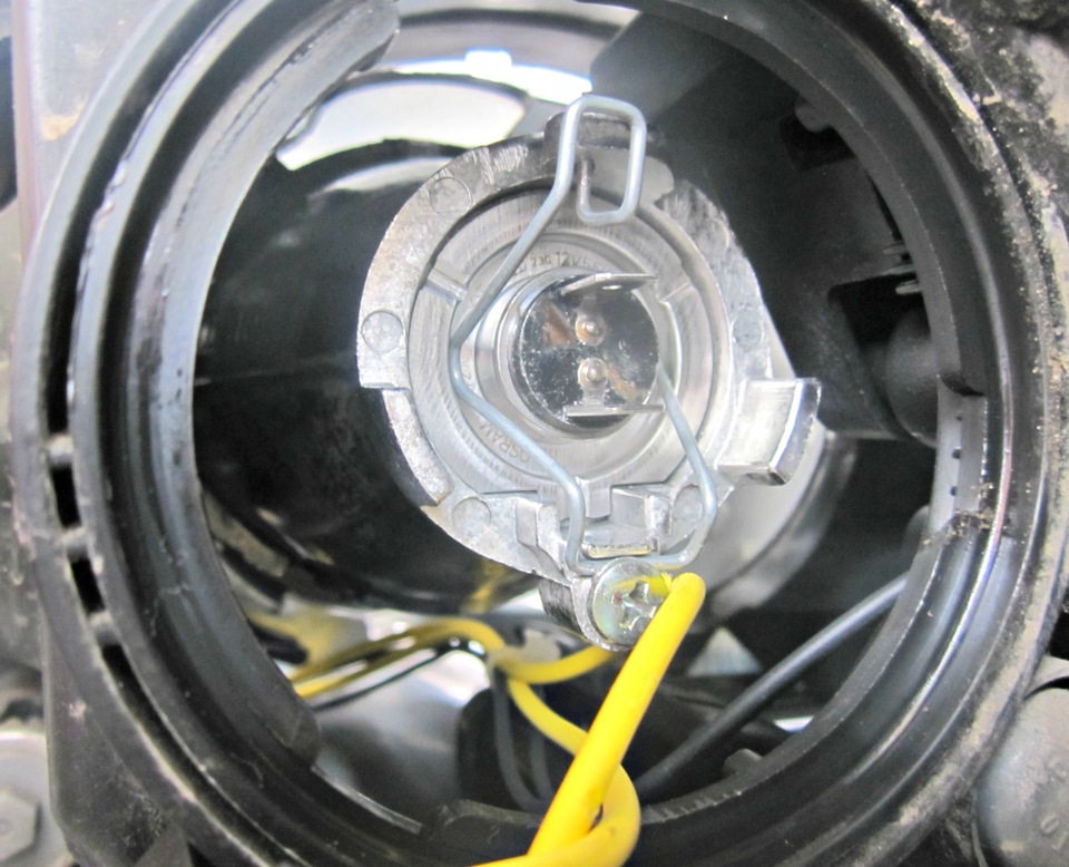 Обнаружение винтов, которые крепят пластмассовый кожух фонарей. Важно не перепутать их с винтами регулировки углов наклона фары - Под снятой крышкой будет виден цоколь лампочки с надетой на него контактной планкой и проводами. Требуется осторожно снять планку с контактов лампы