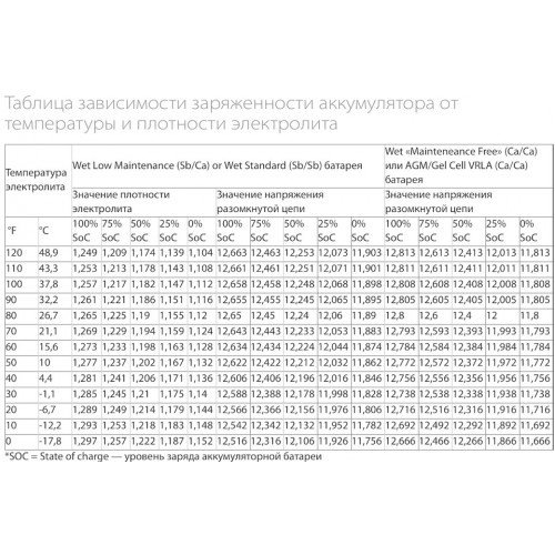 Кроме того, прежде чем продолжить, необходимо принять во внимание две важные вещи: Во-первых, при оценке уровня заряда это следует делать при комнатной температуре, а батарея должна находиться в состоянии покоя не менее получаса. Во-вторых, свинцовые аккумуляторы имеют глубину разряда примерно 50%. Это означает, что только около 50% полной емкости свинцово-кислотного аккумулятора может быть извлечено и использовано.