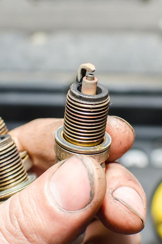 Все дело в износе свечи, который проявляется при большом пробеге – это естественно. Ведь электроды сделаны из металла, который под воздействием температуры и постоянных электрических разрядов начинает потихоньку выгорать. Страдает как верхний похожий на букву «Г», так и нижний. Верхний становится тонким, вместо прямоугольной формы он начинает закругляться, потому как сгорают бока.