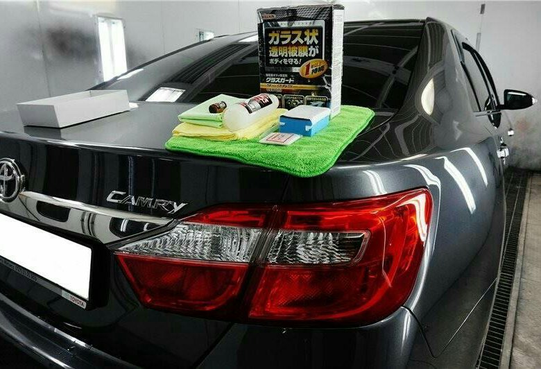 После полировки кузов покрывают жидким стеклом. На нанесение одного слоя требуется не меньше двух часов. За это время покрытие заполняет трещины, обеспечивая защиту и делая цвет ярче.