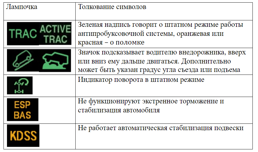 - Зеленый или синий цвета обычно применяются только для того, чтобы проинформировать водителя о том, что функция активирована и все работает нормально. В принципе, на этом можно закончить этот пункт и перейти к расшифровке. Следует начать с более важных и серьезных индикаторов и обозначений.