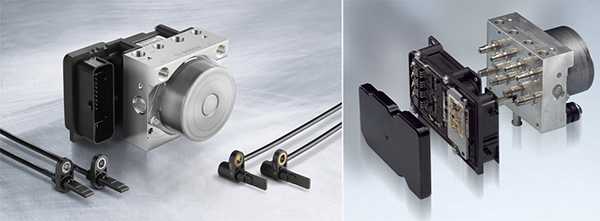 АБС включает в себя две составляющие – электронную и исполнительный модуль. Первая контролирует скорость вращения колес на машине и на основе этого подает сигналы на модуль, а тот предотвращает полную блокировку колес.