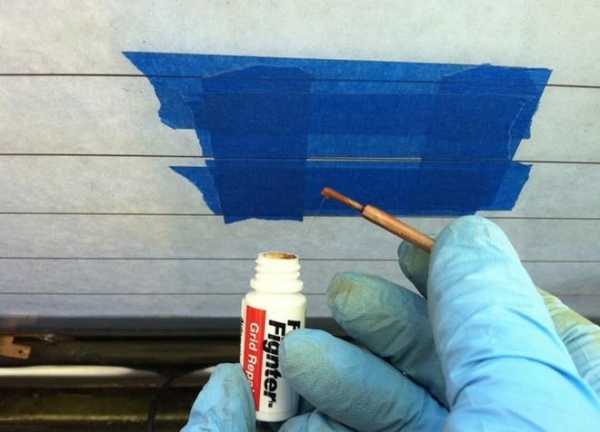 2. Как отремонтировать обогреватель заднего стекла при помощи токопроводящей пасты? Она наносится на места обрыва нитей. При этом захватите оборванные концы с обеих сторон по 2 см на каждую. Паста должна сохнуть сутки. Можно воспользоваться строительным феном и ускорить процесс высыхания.