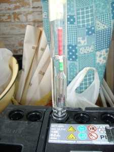 Поочерёдно из каждой банки при помощи груши набираете электролит, чтобы поплавок свободно плавал, и замеряете плотность. По банкам может быть небольшой разброс. Среднее значение плотности 1,27─1,29 гр./см3.
