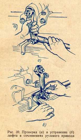 Наличие зазоров в сочленениях рулевого привода определяют, резко покачивая сошку руля при поворотах рулевого колеса, охватывая рукой проверяемые сопряжения (рис. 39, а).