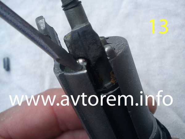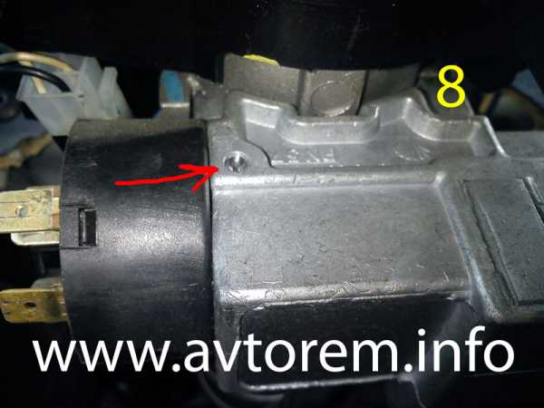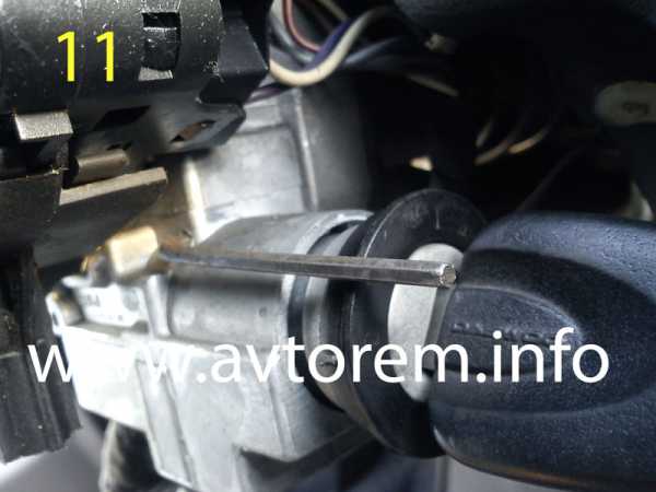 3 .Причина поломки, после снятия контактной группы, стала очевидна (фото 10). Отломался хвостовик личинки замка зажигания. Вытащить личинку не сложно, достаточно проволокой (штырем) диаметром 2-3мм, загнутой буквой Г (я для этого использовал шестигранник), нажать фиксатор через отверстие (фото 11) и в это время повернуть ключ во второе положение. Если, все правильно сделать, то личинка сама выйдет из корпуса на 5 мм. Вам останется только вытащить ее полностью. Возможно некоторых посетит мысль, а не проще, снять и заменить замок зажигания полностью, личинку с корпусом!? Мысль отличная! Правда довольно проблемная, так как для того, чтобы добраться до крепежных болтов, придется снять рулевую колонку, а это уже серьезная работа. Так что, снимать замок зажигания целиком, не советую. Проще, все-таки снять личинку замка зажигания