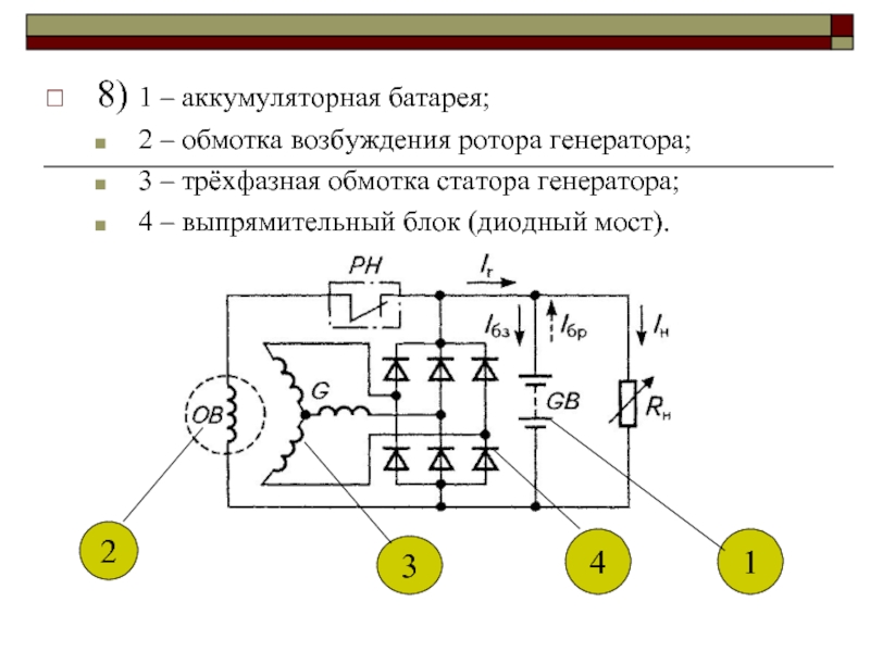 Когда двигатель работает, зарядный ток от генератора переменного тока протекает через трио диодов через соединение BAT (B +) на задней панели генератора. Небольшой ток также протекает через цепь светового индикатора зарядки. На генераторах GM цепь светового индикатора — это клемма 1. На генераторах европейского стандарта цепь светового индикатора обычно обозначается как 61 или D +. На азиатских генераторах он обычно обозначается L.Эта клемма ведет к заземленной стороне сигнальной лампы генератора. Когда генератор заряжается, трио диодов подает напряжение на массу светового индикатора. Это смещает напряжение аккумуляторной батареи, приложенное к положительной стороне лампы, в результате чего лампа гаснет после запуска двигателя. Если генератор перестает заряжаться, через световую цепь с положительной стороны протекает ток, в результате чего загорается сигнальная лампа системы зарядки.