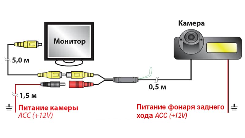 Вне зависимости от способа коммутации шнур заземления крепится к кузову автомашины в багажном отделении (в конструкции автомобилей предусмотрены специальные болты для подачи отрицательного сигнала питания). Светодиоды подсветки коммутируются параллельно основной цепи питания. Постоянная подача питания к видеокамере запрещается, поскольку устройство выходит из строя.