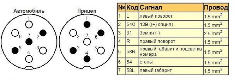 Подключение розетки прицепа и фаркопа легкового и грузового автомобиля, схема по цветам, распиновка