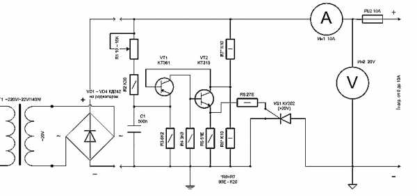Схема состоит из 14 резисторов, 5 транзисторов, 2 стабилитронов, диода, потенциометра (часто в телевизорах встречается потенциометр на 10 килоом), подстроечного сопротивления. Нам понадобится тиристор Q 202 и тумблер. Для индикации тока амперметр, для напряжения – вольтметр.