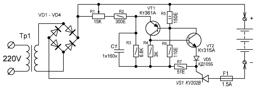 Глядя на схему, первое на что обращаешь внимание, это отсутствие сглаживающего конденсатора после диодного моста VD1. На самом деле, в этой схеме это принципиально важно. Сама схема зарядного устройства представляет собой не что иное, как регулятор мощности с фазоимпульсным управлением. VT1 и VT2 включены по схеме одно переходного транзистора. Время, за которое они переключаются определяется зарядом конденсатора С1. А время за которое конденсатор С1 зарядится, зависит от сопротивления резисторов, через которые он подключен к напряжению питания — в схеме это R1R2. Резистор R1 у нас переменный, значит этим временем можно управлять. Путём заряда-разряда, переключения VT1VT2 и формируется управляющий импульс на тиристоре VS1.